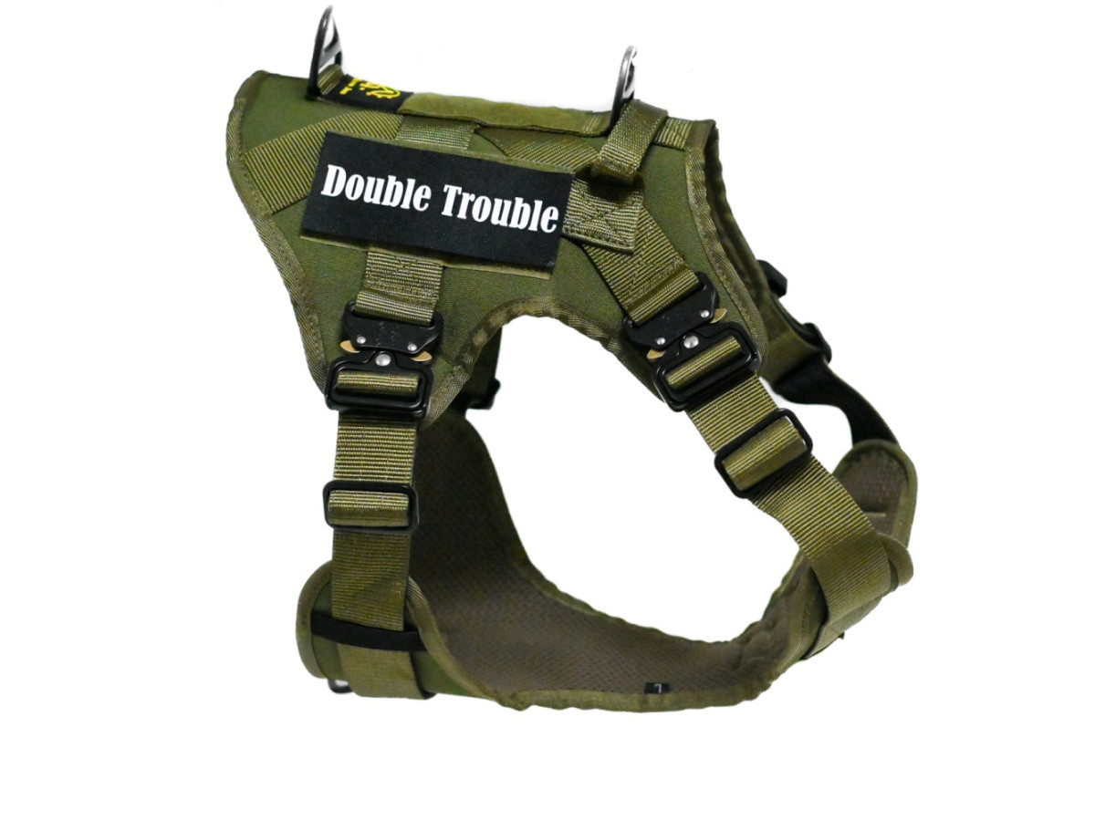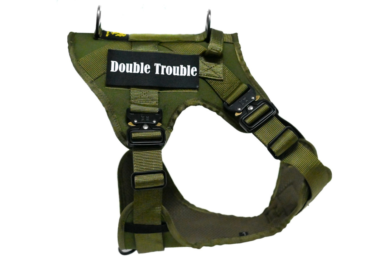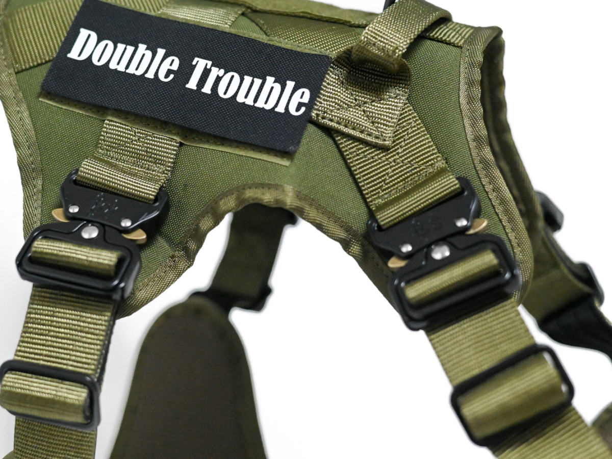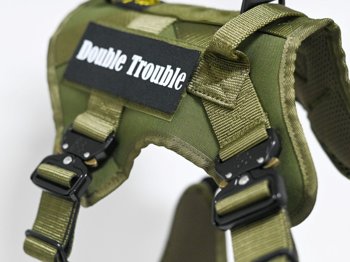Oprsnica je dobavljena z Double Trouble našitki, lahko pa naročite tudi lastne personalizirane Velcro našitke z imenom psa ali poljubnim besedilom.