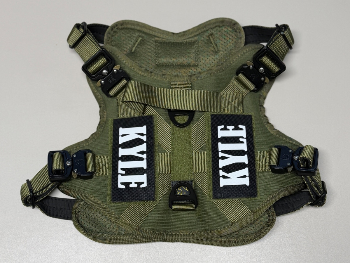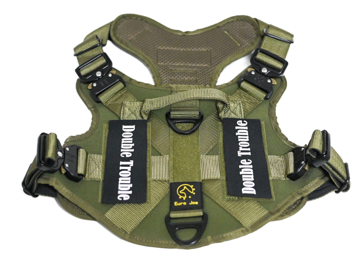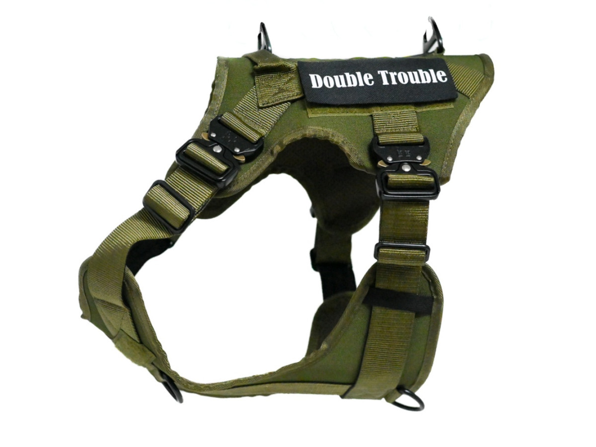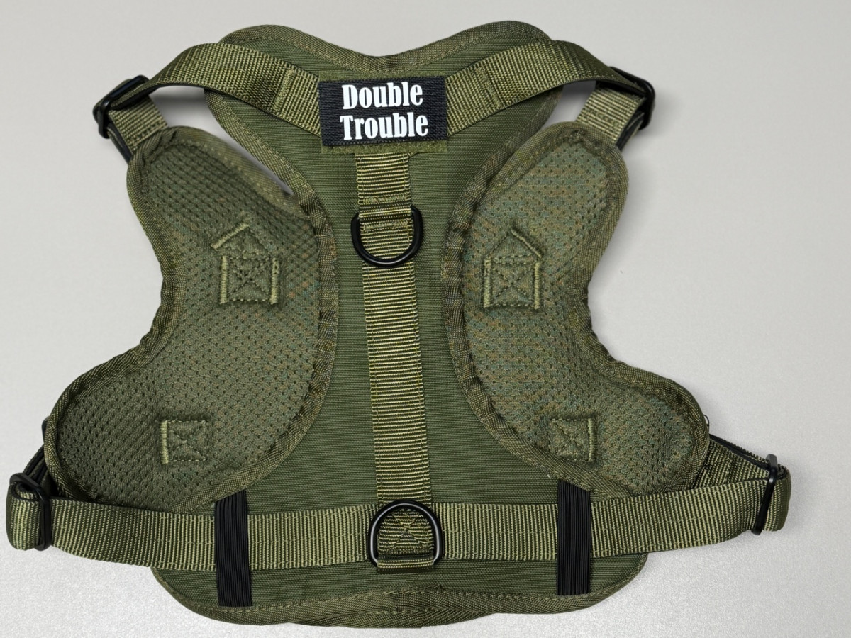Oprsnica je dobavljena z Double Trouble našitki, lahko pa naročite tudi lastne personalizirane Velcro našitke z imenom psa ali poljubnim besedilom.